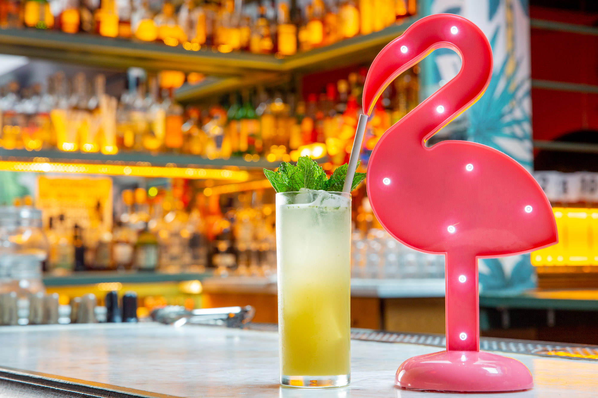 The cocktails at the Happiest Hour speak for themselves. Just in line with the paradise theme of the bar the cocktails themselves are bright and colorful. Evoking a night spent on the boardwalk with your toes buried in the sand. The colors of the drinks are vibrant and tropical. A lot of neon greens, ruby reds and carrot oranges. It’s not hard to make these drinks colorful when I photograph them but I still take care to accentuate those colors. Position my lighting to shine through the drink and make them glow from within. And when I’m editing them add a little extra color and deeply saturate the reds and greens. Also because the Happiest Hour has a whimsical beach theme there’s a lot of fun things to play with. Placing the drinks on paintings of drinks mimicking their shadows is fun. And having a pink flamingo take a sip from one of the drinks. There’s so much character inherent in the details and as a photographer my goal is to find those details and accentuate them. I don’t want this to be any bar. I want my work to BE the Happiest Hour.