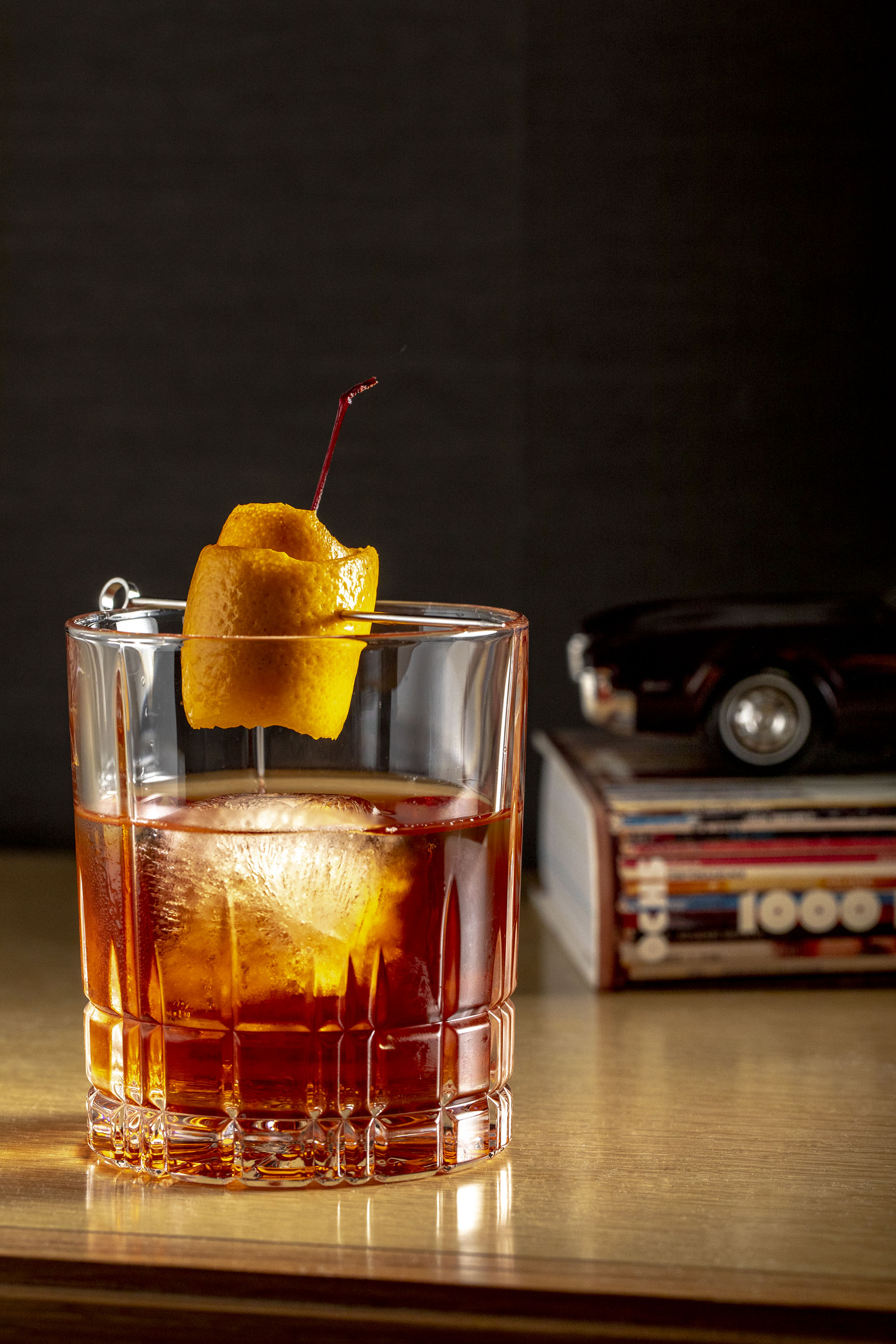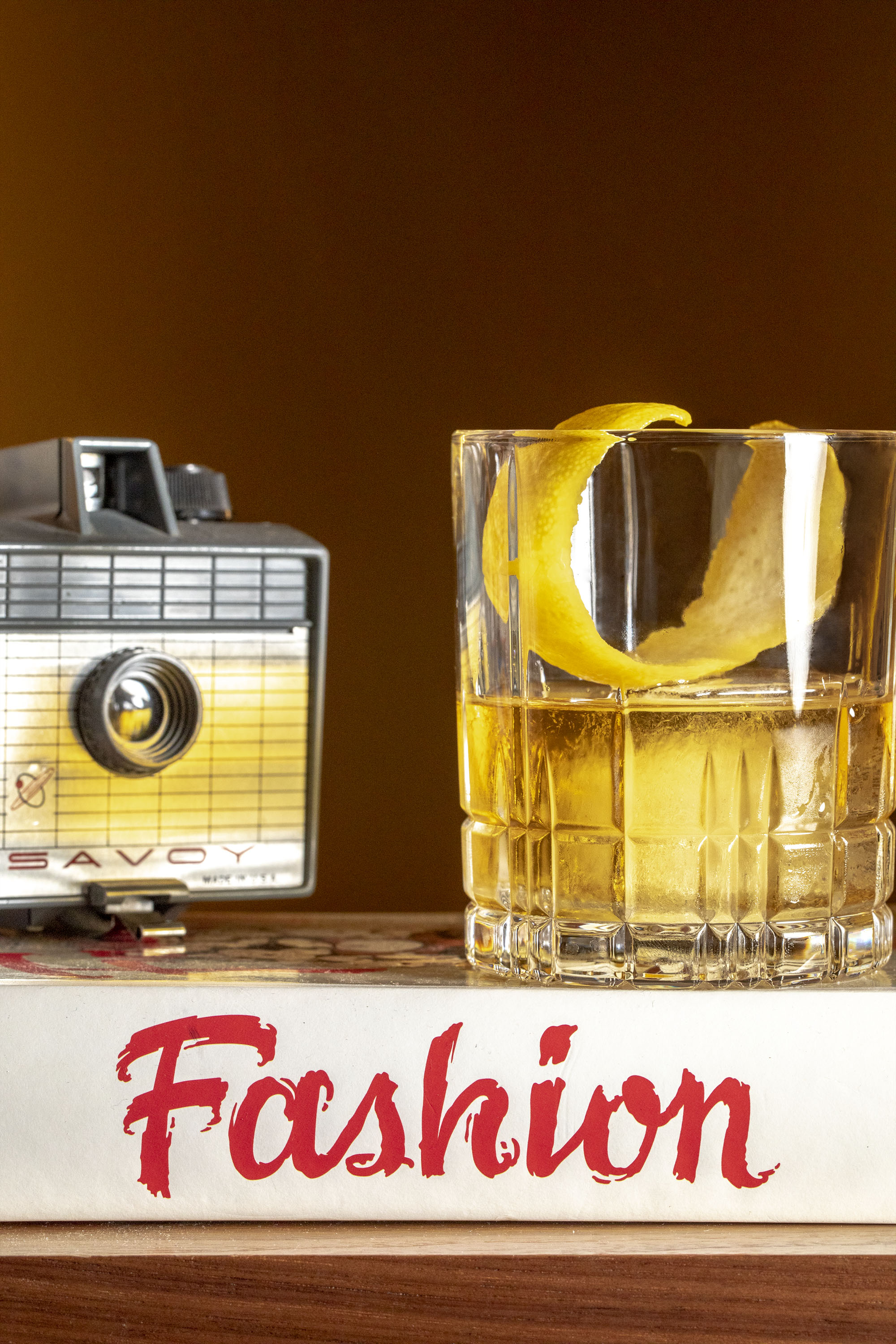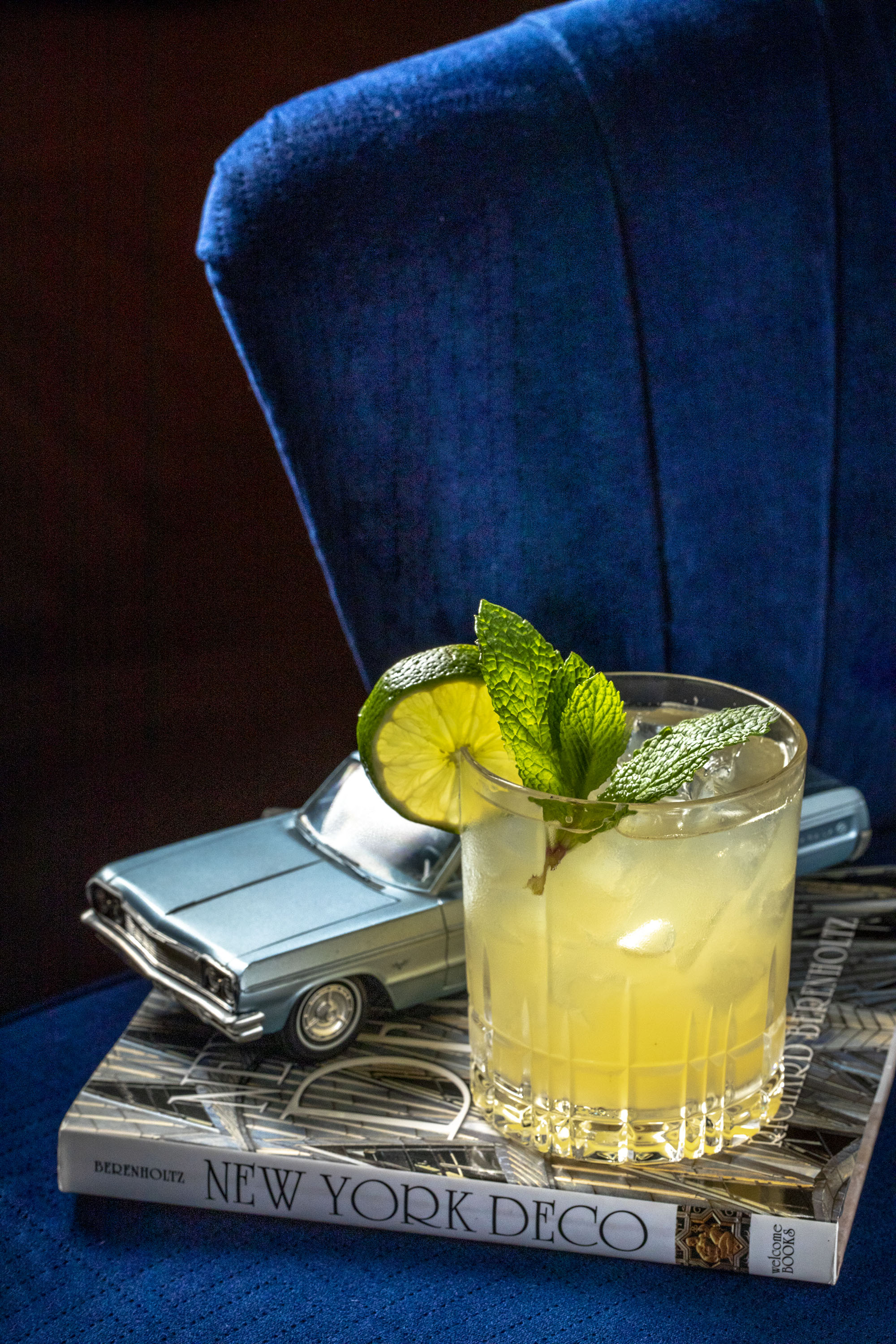 For this shoot we wanted to create some interesting little vignettes. The lobby is full of interesting little knick knacks that we used as props. Because they’re an international brand their marketing director couldn’t be onsite and I worked with their bartender and PR agent to come up with these scenarios. We took safety shots where it was just the cocktail by itself. But I love how the props help to bring the cocktails to life and give them an attitude. Just simple little elements. A book with the title Fashion and a old camera looking over the shoulder of the cocktail. Or the model car sitting on the blue velvet chair. A gentle color story and a choice made to play off the yellow of the cocktail and the green of the garnish. It’s a little bit playful and a little bit sophisticated and the kind of visual story that gets the viewers attention.