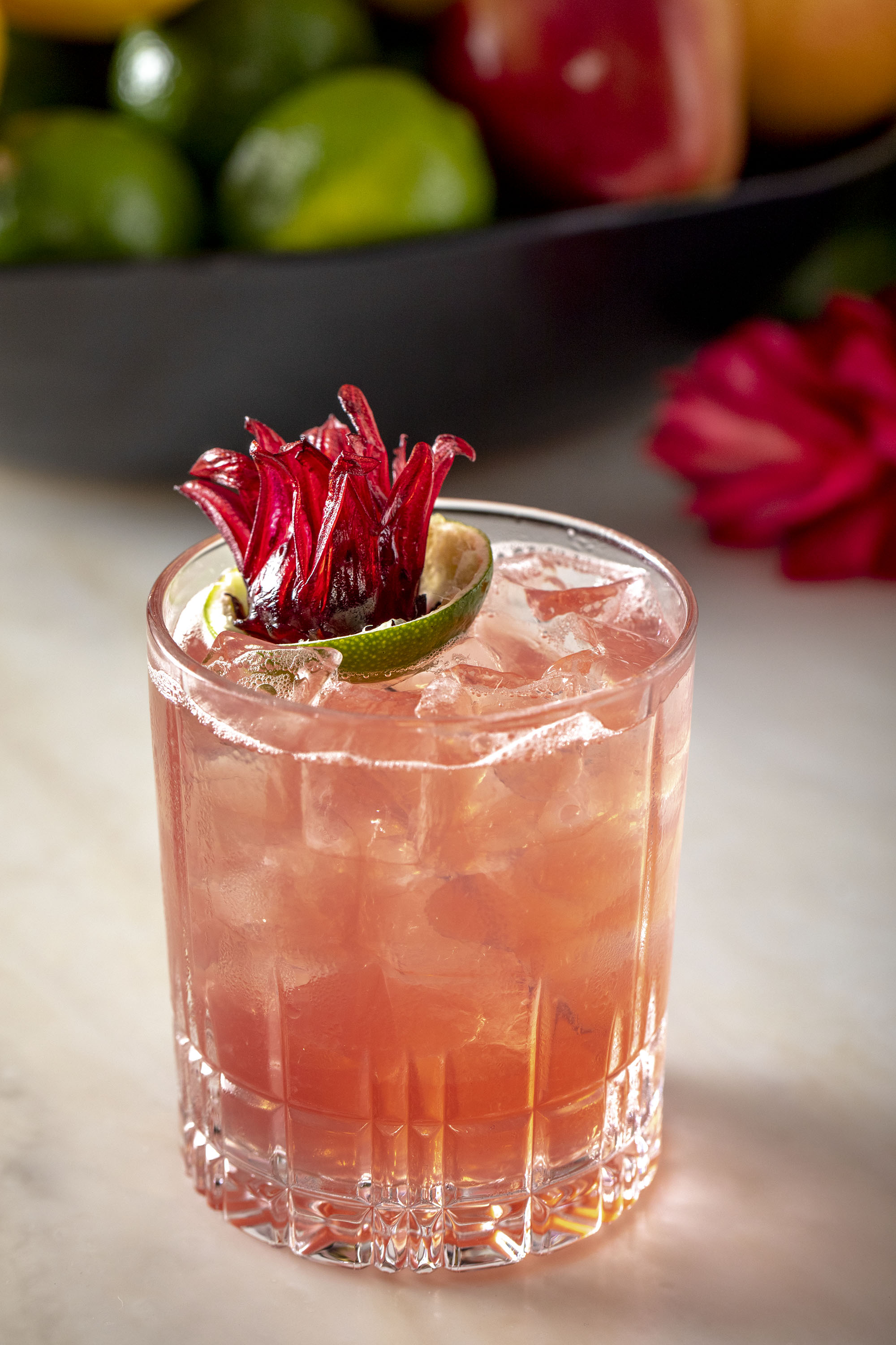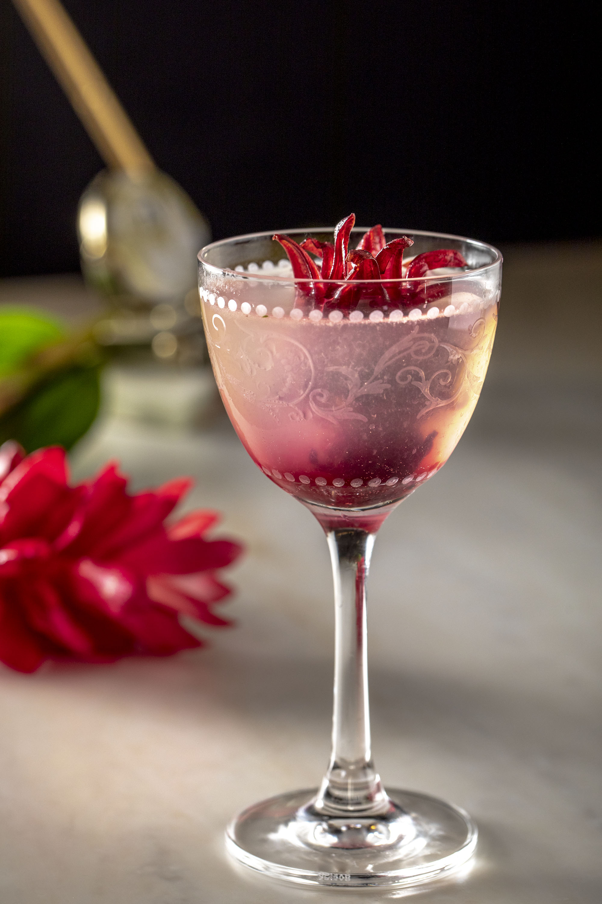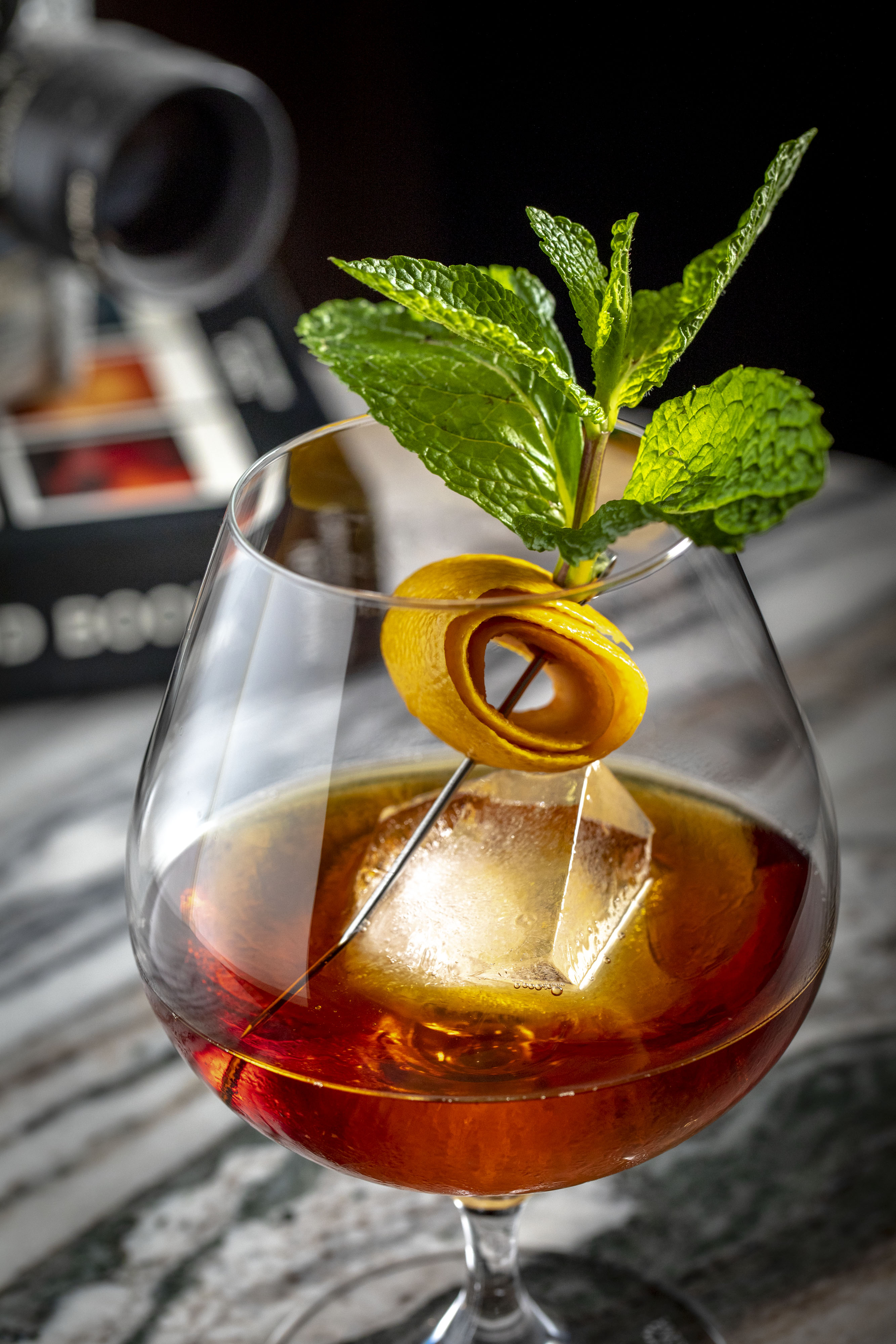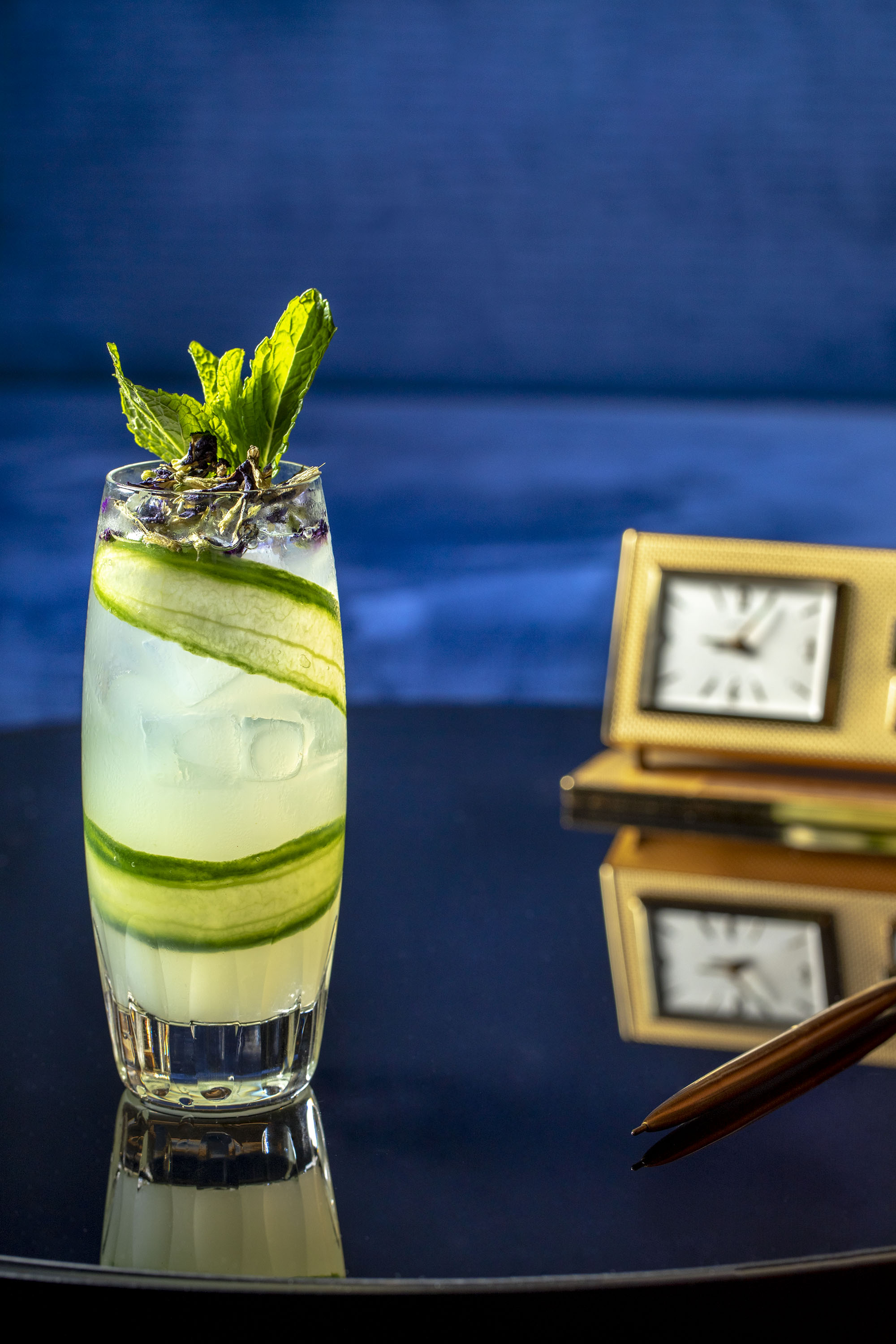 For this shoot we wanted to create some interesting little vignettes. The lobby is full of interesting little knick knacks that we used as props. Because they’re an international brand their marketing director couldn’t be onsite and I worked with their bartender and PR agent to come up with these scenarios. We took safety shots where it was just the cocktail by itself. But I love how the props help to bring the cocktails to life and give them an attitude. Just simple little elements. A book with the title Fashion and a old camera looking over the shoulder of the cocktail. Or the model car sitting on the blue velvet chair. A gentle color story and a choice made to play off the yellow of the cocktail and the green of the garnish. It’s a little bit playful and a little bit sophisticated and the kind of visual story that gets the viewers attention.